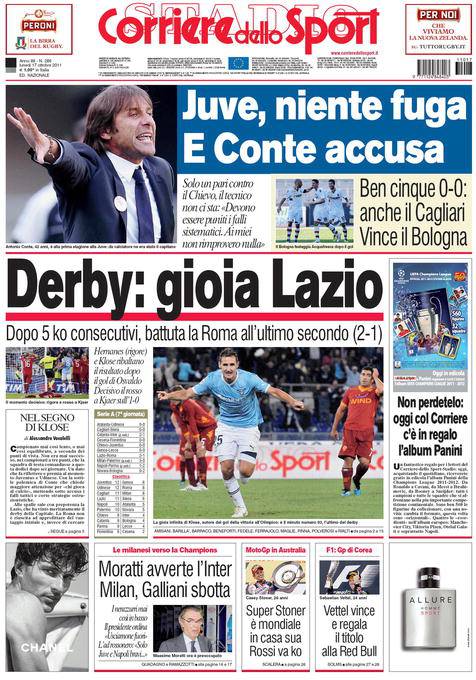 CORRIERE LAZIO – Sul Corriere dello Sport si parla del derby tra Roma e Lazio con i biancocelesti che hanno vinto due a uno.