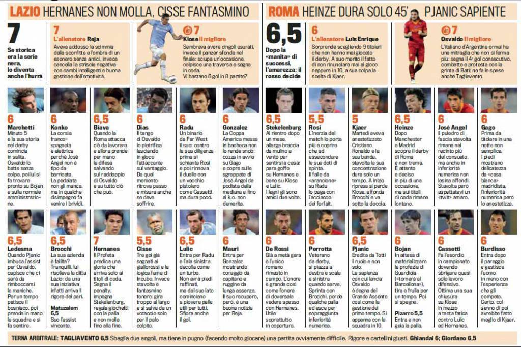 LAZIO ROMA VOTI PAGELLE GAZZETTA FOTO – La Lazio vince il derby di Roma per due a uno. Grande prova di Klose, il migliore per la Lazio, bene anche Brocchi ed Hernanes. Nella Roma solito Osvaldo con il suo quarto gol consecutivo. Ecco i voti e le pagelle di Lazio-Roma della Gazzetta dello Sport.