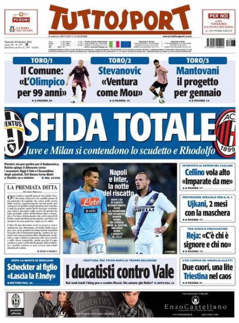 Tuttosport: Sfida totale 18/10/2011 di Ruggieri TUTTOSPORT JUVENTUS MILAN – Su Tuttosport si parla di Juventus e Milan che si sfideranno per lo Scudetto e per Rhodolfo. Claudio Ruggieri – www.calciomercatonews.com