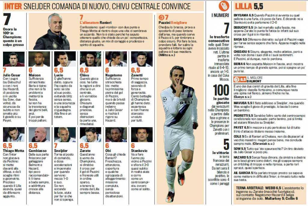 LILLE INTER VOTI PAGELLE GAZZETTA – L’Inter vince in trasferta a Lille contro i campioni di Francia per uno a zero grazie al gol di Pazzini, migliore in campo. Bene anche Sneijder e Zarate così come Julio Cesar. Ecco le pagelle della Gazzetta dello Sport.