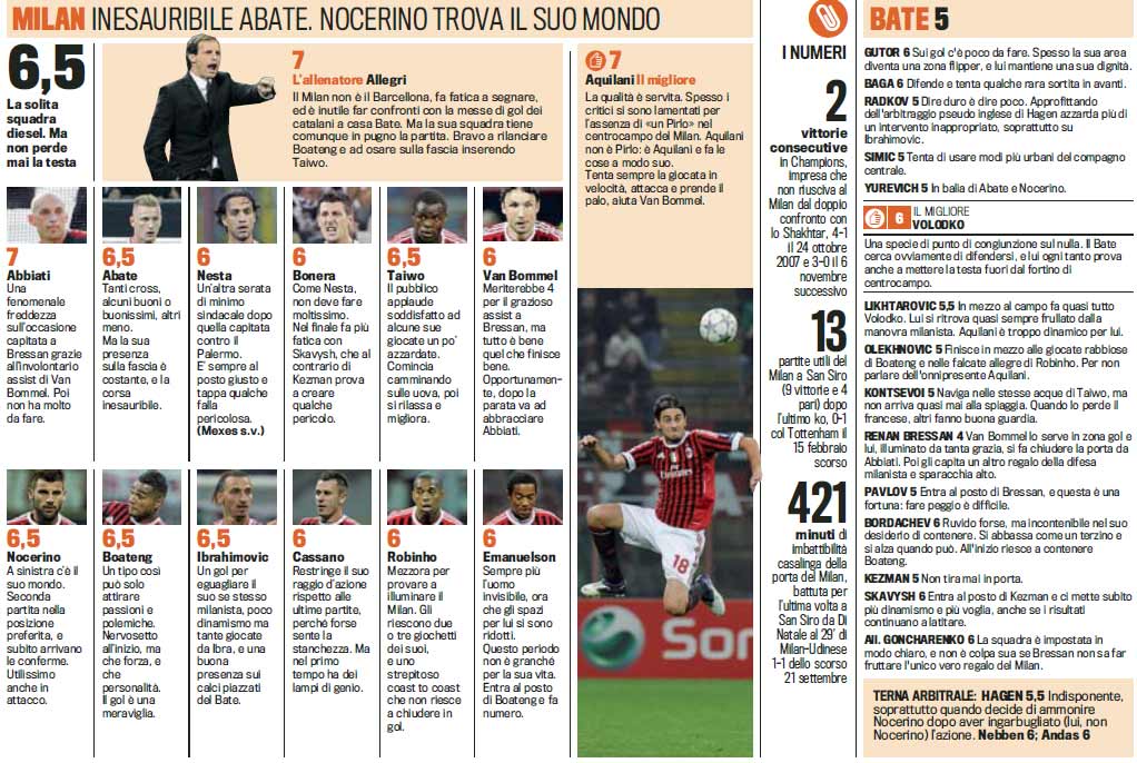 MILAN BATE BORISOV VOTI PAGELLE GAZZETTA FOTO – Il Milan vince due a zero contro il Bate Borisov grazie alle reti di Ibrahimovic e Boateng. Per la Gazzetta dello Sport il migliore in campo è Alberto Aquilani, centrocampista rossonero. Ecco i voti e le pagelle.
