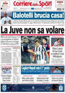 RASSEGNA STAMPA CORRIERE DELLO SPORT – Anche il Corriere dello Sport evidenzia la difficoltà di vincere della Juventus contro le cosiddette “piccole”. In taglio alto, la notizia di Balotelli che, giocando con dei petardi in casa, ha dato vita ad un piccolo incendio nella sua casa fuori Manchester. In taglio basso, occhi puntati su Cagliari-Napoli che può valere il primo posto.