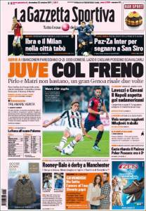 RASSEGNA STAMPA GAZZETTA DELLO SPORT – La Gazzetta dello Sport dedica la prima pagina al pareggio di ieri sera della Juventus, bloccata dal Genoa sul 2 a 2. In taglio alto, spazio alle milanesi, con il Milan che cerca di vincere a Lecce dopo 10 anni e l’Inter che schiera in attacco Pazzini e Zarate per ritrovare la vittoria tra le mura amiche.