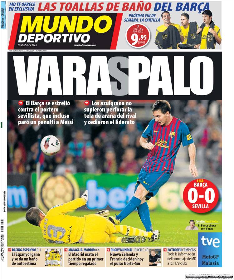 RASSEGNA STAMPA MUNDO DEPORTIVO – Resta al palo il Barcellona di Pep Guardiola, bloccato in casa dal Sevilla ma, soprattutto, da una grandissima prestazione di Varas, portiere avversario che, nel finale, ha anche parato un rigore a Messi.