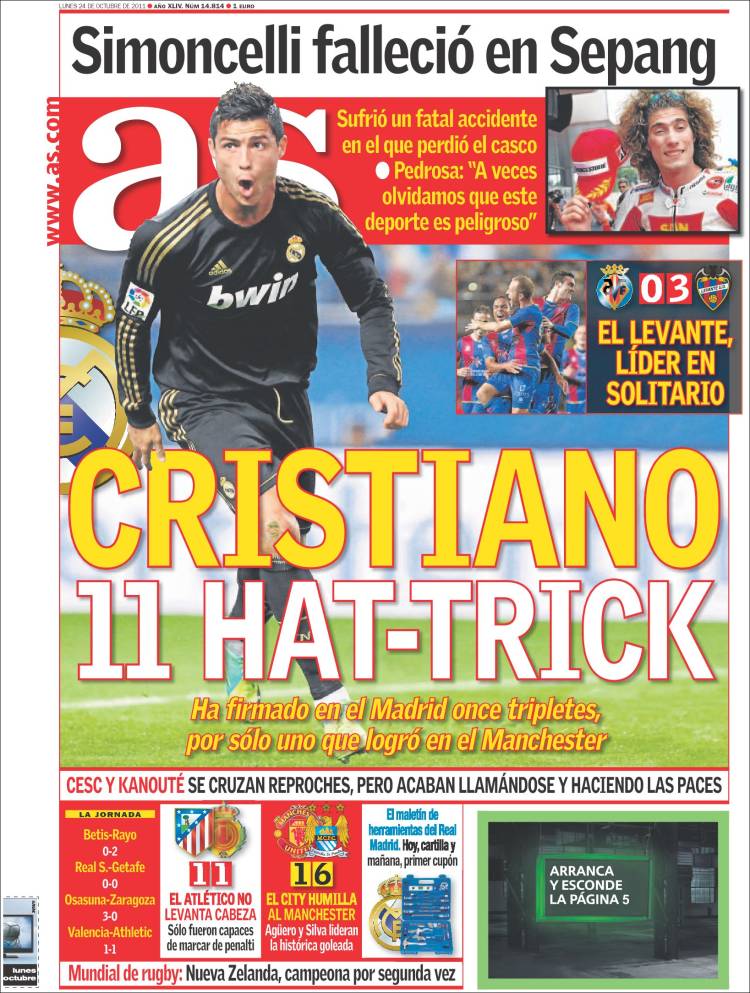 RONALDO REAL MADRID – Sul quotidiano As si parla di Cristiano Ronaldo che contro il Malaga ha segnato l’undicesima tripletta con la maglia del Real Madrid.