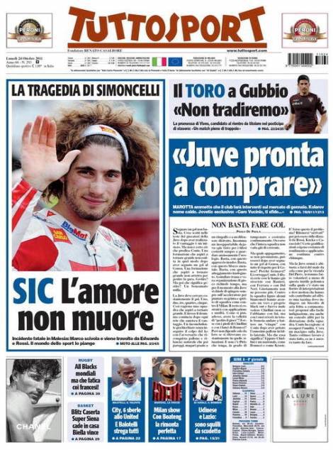 TUTTOSPORT SIMONCELLI – Tuttosport parla della morte di Simoncelli, ricordando con affetto il pilota italiano.