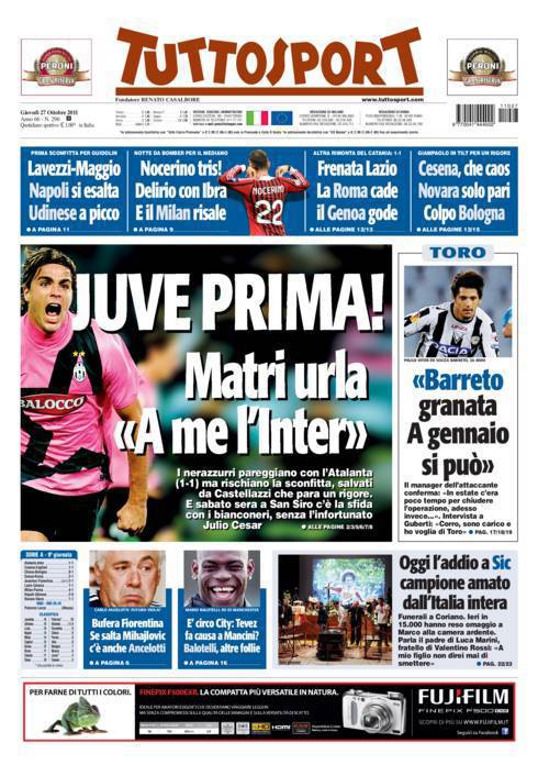 TUTTOSPORT MATRI JUVENTUS – La Juventus torna prima in classifica e sabato c’è il grande match contro l’Inter.