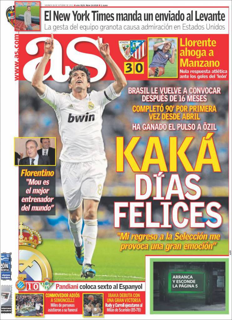 AS KAKA’ – Sul quotidiano As si parla di Kakà, trequartista brasiliano del Real Madrid che vive giorni felici.