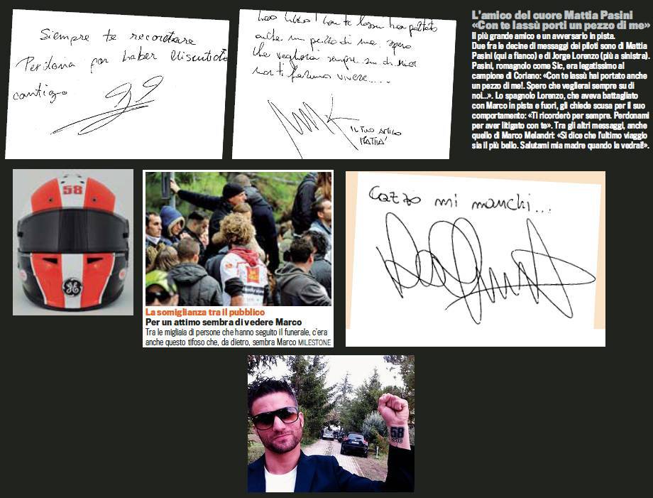 FUNERALI SIMONCELLI – L’ultimo viaggio terreno di Simoncelli si è concluso ieri, con i funerali di Coriano. Un appuntamento a cui hanno partecipato in migliaia, tutti stretti attorno alla famiglia Simoncelli, umana e normale come poche. Al funerali, nel paesino romagnolo di colpo diventato l’ombelico del mondo, c’erano persone comuni ma anche vip come Valentino Rossi, Lorenzo, Pasini, Capirossi, e molti altri esponenti del mondo delle corse. La redazione di Calciomercatonews.com ha voluto raccogliere, spulciando il Corriere dello Sport e La Gazzetta dello Sport, le immagini più significative e per certi versi più toccanti di ieri, e nel contempo ha voluto ricordare per l’ennesima volta un grandissimo che ora ci guarda dall’alto: ciao Sic!