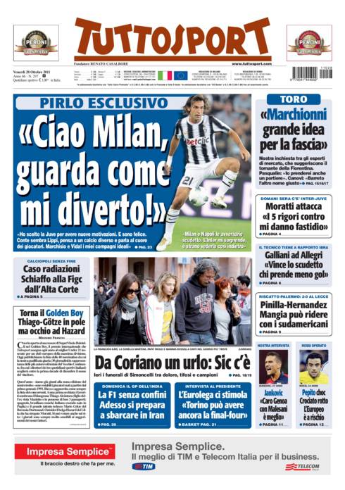 TUTTOSPORT MILAN – Su Tuttosport intervista esclusiva ad Andrea Pirlo centrocampista della Juventus che parla del suo passato rossonero.