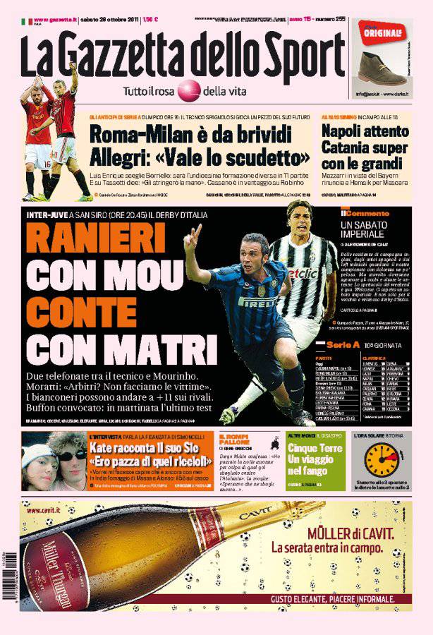 GAZZETTA RANIERI MOURINHO CONTE MATRI – Sulla Gazzetta dello Sport si parla del grande match di questa sera tra Inter e Juventus.