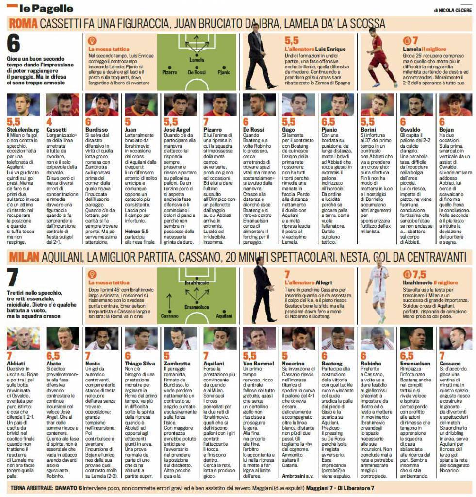 ROMA MILAN VOTI PAGELLE GAZZETTA DELLO SPORT FOTO – Bellissimo il match all’Olumpico di Roma tra i giallorossi ed il Milan. La squadra meneghina ha trionfato grazie ad un super Ibrahimovic che è tornato a dominare il campo. La Gazzetta dello Sport lo ha premiato infatti come migliore in campo, nelle pagelle della partita. Migliore per la Roma è invece Erik Lamela, subentrato, ma rabbioso e decisivo.