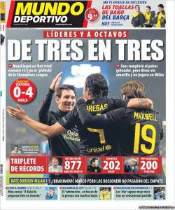 MUNDO DEPORTIVO MESSI – Il Barcellona vince quattro a zero contro il Viktoria Plzen grazie alla 13esima tripletta di Messi e al gol di Fabregas. Barcellona agli ottavi di finale e momtentaneamente al primo posto in classifica.