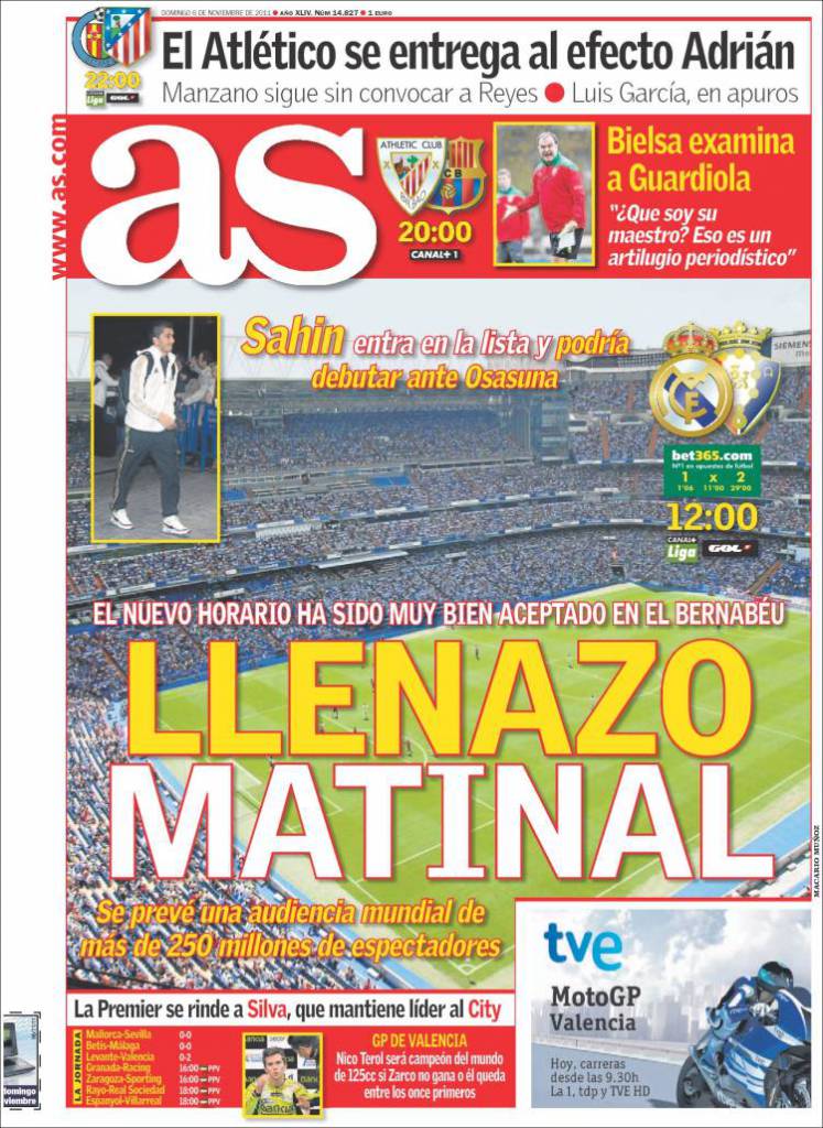 RASSEGNA STAMPA ESTERA AS – AS si concentra sul grande successo del anticipo di mezzogiorno della Liga. Infatti, al Santiago Bernabeu ci dovrebbe essere il tutto esaurito, con 85.000 biglietti venduti e addirittura 250 milioni di spettatori collegati da tutto il mondo.