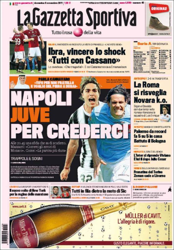 RASSEGNA STAMPA GAZZETTA DELLO SPORT – Occhi puntati sul big match tra il big match del San Paolo tra Napoli e Juventus, posticipo dell’undicesima giornata di Serie A, nella prima pagina odierna de La Gazzetta dello Sport.. In taglio alto, le parole di Ibrahimovic dedicate ad Antonio Cassano.