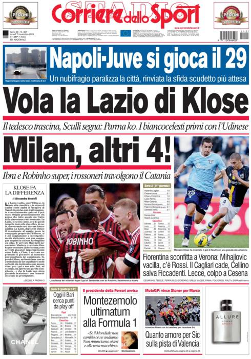 CORRIERE LAZIO KLOSE – Sul Corriere dello Sport si parla della Lazio che vince uno a zero contro il Parma grazie a Sculli. Super Klose.