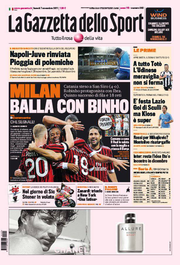 GAZZETTA MILAN BINHO – Sulla Gazzetta dello Sport si parla del Milan che vince quattro a zero contro il Catania.