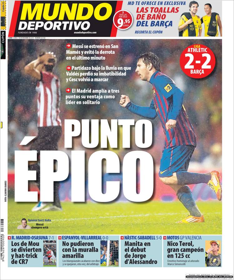 MUNDO DEPORTIVO BARCELLONA – Il Barcellona pareggia nel recupero contro l’Atletico Bilbao grazie a Messi e sotto un diluvio importante.