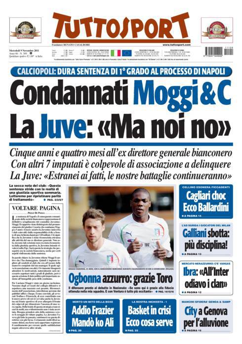 TUTTOSPORT MOGGI JUVENTUS – Anche Tuttosport in prima pagina sbatte le sentenze di Calciopoli che hanno condannato Moggi e soci.