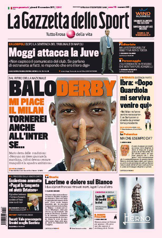 BALOTELLI MILAN INTER – Sulla Gazzetta dello Sport parla di Balotelli che ieri ha dichiarato di poter tornare all’Inter.