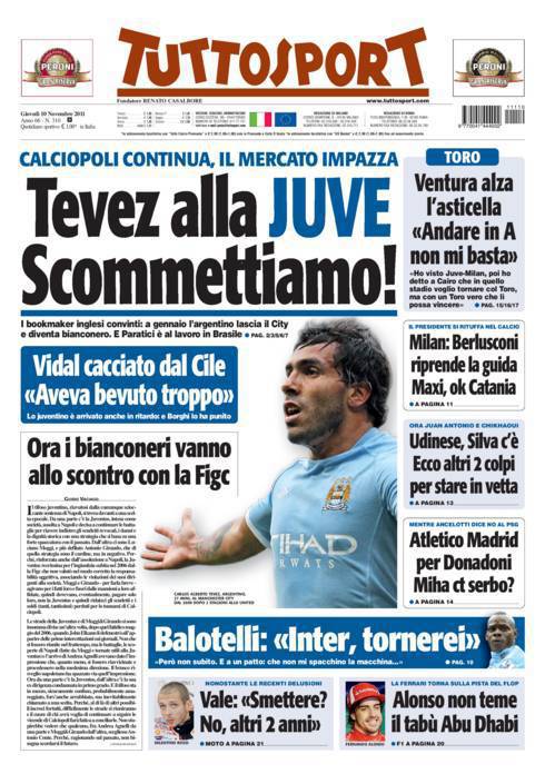 TUTTOSPORT TEVEZ JUVENTUS – Su Tuttosport si parla di Tevez che potrebbe arrivare presto alla Juventus.