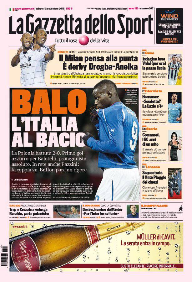 GAZZETTA ITALIA BALOTELLI – L’Italia vince due a zero contro la Polonia con il primo gol in azzurro di Balotelli e con la rete di Pazzini.