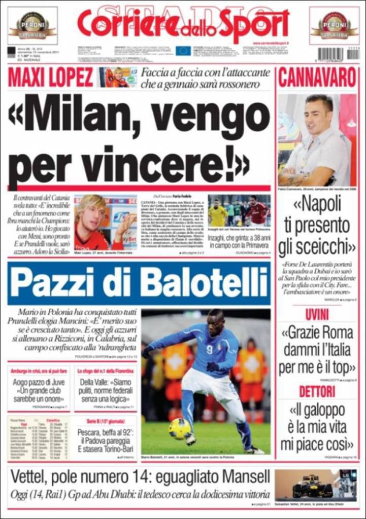 CORRIERE DELLO SPORT MILAN – Prima pagina del Corriere dello Sport, dedicata a Maxi Lopez, attaccante del Catania che a Gennaio potrebbe lasciare la Sicilia per approdare al Milan. L’attaccante, ha dichiarato, di voler vincere a tutti i costi con i rossoneri…