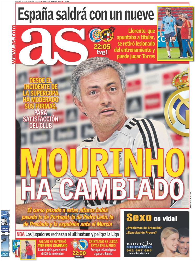 AS MOURINHO – Il quotidiano As parla del cambiamento di Mourinho che ha moderato i suoi modi di fare dopo il fattaccio della Supercoppa.