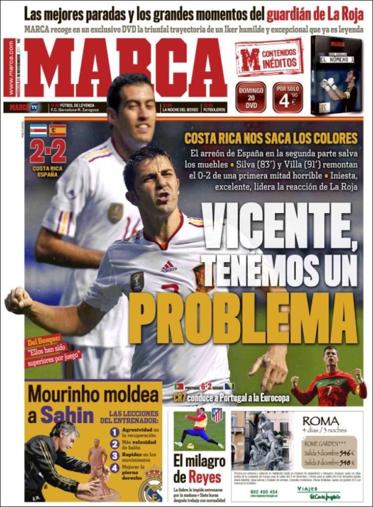 MARCA SPAGNA – La Spagna non va oltre il due a due contro la Costarica. Primi problemi per Del Bosque.