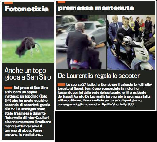 FOTONOTIZIA – Due curiose foto ci giungono dal sabato sera di calcio. La prima riguarda San Siro, dove un topo ha attraversato il prato poco prima della sfida fra Inter e Cagliari. La seconda riguarda invece il famoso scooter che ha consegnato De Laurentiis al ragazzo che gli aveva dato il passaggio durante i sorteggi dei calendari di Serie A. Entrambe le foto sono prese da La Gazzetta dello Sport.