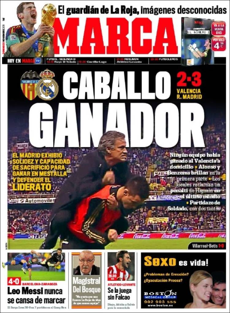 RASSEGNA STAMPA ESTERA MARCA – Il Real Madrid è il cavallo ‘vincitore’. Marca esalta la vittoria in trasferta dei ragazzi di Mourinho che hanno dimostrato “solidità e capacità di sacrificio per vincere al Mestalla e difendere la vetta della classifica”. In taglio basso, un complimento a Messi: “Non si stanca mai di segnare”.