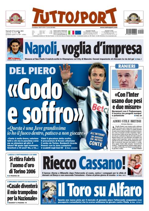 TUTTOSPORT DEL PIERO – Tuttosport parla delle dichiarazioni di Del Piero che parla di una super Juventus ma soffre restando in panchina.