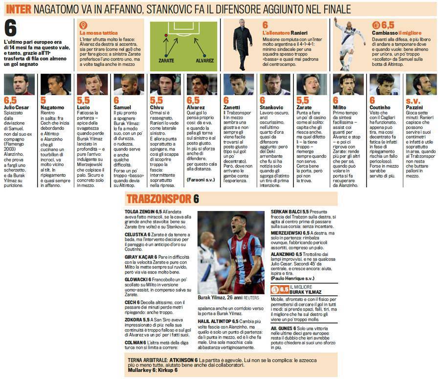 TRABZONSPOR INTER VOTI PAGELLE GAZZETTA FOTO – L’Inter pareggia uno a uno a Trebisonda contro il Trabzonspor e si qualifica come prima classificata agli ottavi di finale di Champions League. I nerazzurri conducono un match attento e intelligente anche se rischiano in qualche occasione. Inter in vantaggio grazie ad Alvarez, il giovane argentino sembra dare segni di risveglio importanti. Bella l’azione del gol con uno scambio con il connazionale Milito. In difesa l’Inter soffre soprattutto a destra con il rientrante Nagatomo. Al centro anche Lucio sbanda mentre Samuel è il migliore. Il pareggio dei turchi è con Altintop su deviazione sfortunata proprio di Samuel. Ecco le pagelle e i voti della Gazzetta dello Sport.