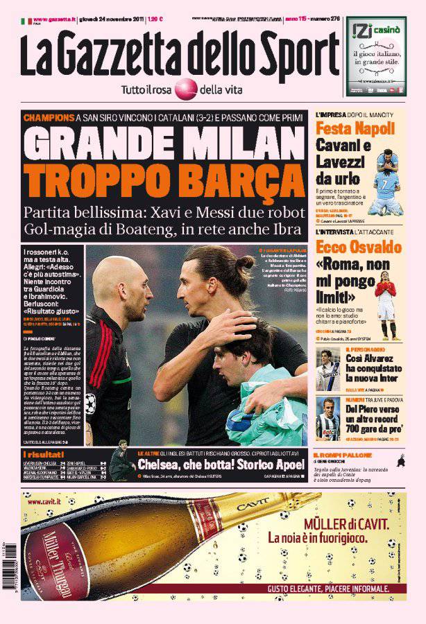 Gazzetta dello Sport: Grande Milan troppo Barça 24/11/2011 di Ruggieri GAZZETTA MILAN BARCELLONA – Sulla Gazzetta dello Sport si parla di Milan-Barcellona, con i catalani che vincono tre a due a San Siro. Claudio Ruggieri – www.calciomercatonews.com