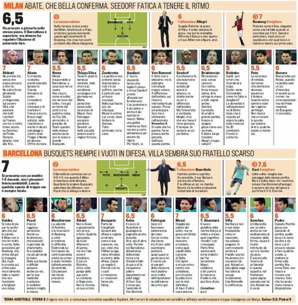 MILAN BARCELLONA VOTI PAGELLE GAZZETTA – Il match di ieri tra Milan e Barcellona è stato uno spot per il calcio mondiale. Il Barcellona ha vinto tre a due a San Siro e si è qualificato agli ottavi di finale di Champions League come primo nel girone. Al Milan toccherà la seconda piazza. I rossoneri hanno rimontato due volte il Barcellona prima con Ibrahimovic poi con un super gol di Boateng. Per il Barcellona super Messi che segna su rigore, il primo gol dei catalani è arrivato con l’autogol di Van Bommel mentre il terzo gol è di Xavi. Ecco i voti e le pagelle della Gazzetta dello Sport.