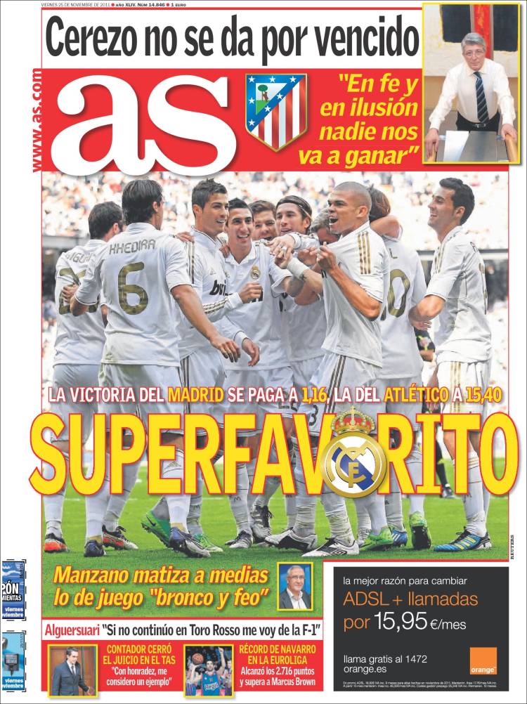 AS REAL MADRID – Sul quotidiano As si parla del derby tra Real e Atletico che vede la squadra di Mourinho favorita.
