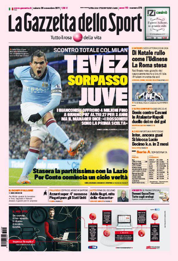 GAZZETTA TEVEZ JUVENTUS – Sulla Gazzetta dello Sport si parla di Tevez, la Juventus supera il Milan.