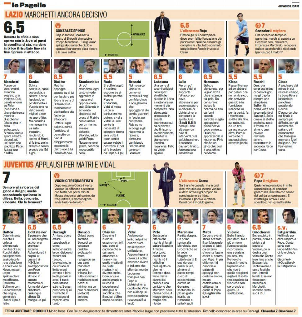 LAZIO JUVENTUS VOTI PAGELLE GAZZETTA DELLO SPORT – Vince ancora la Juventus, resta imbattuta e si riporta in vetta alla classifica, ma la vera notizia è che ha ancora una partita da recuperare, quella contro il Napoli. Continua il momento d’oro di Simone Pepe, che manda in buca per la seconda volta consecutiva e regala i tre punti alla squadra di Antonio Conte. Il laterale è stato scelto come migliore dei suoi dalla Gazzetta dello Sport, 7, stesso voto di Gonzalez migliore dei biancocelesti.
