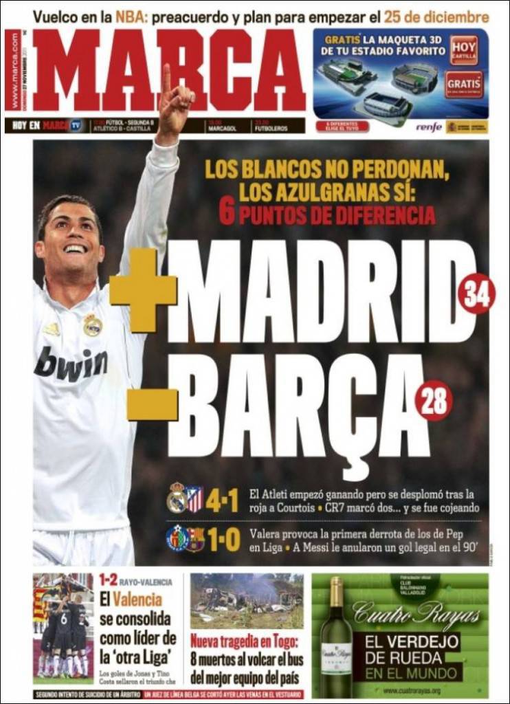 MARCA RASSEGNA STAMPA ESTERA – Sorride Cristiano Ronaldo nella prima pagina di Marca. Il quotidiano spagnolo di Madrid gongola dopo la grande vittoria del Real nel derby contro l’Atletico e, soprattutto, per la sconfitta del Barcellona contro il Getafe, che lancia la squadra di Josè Mourinho a 6 lunghezze dall’undici di Pep Guardiola, che trovano la prima sconfitta stagionale. In taglio basso, spazio al Valencia, vincente sul campo del Rayo Vallecano e “leader” dell'”altra liga” così definita dallo stesso quotidiano, perchè terza alle spalle delle due superpotenze.