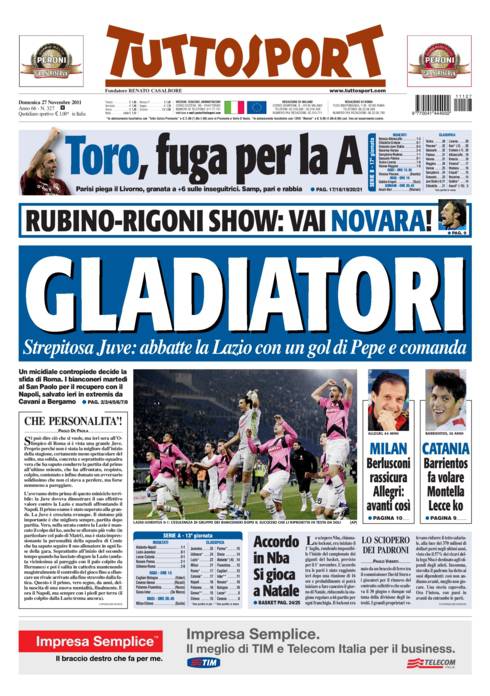 TUTTOSPORT RASSEGNA STAMPA – Se già la Gazzetta e il Corriere dello Sport esaltavano la Juventus, non poteva essere da meno Tuttosport. Il quotidiano torinese definisce addirittura “Gladiatori” i ragazzi di Antonio Conte che si riportano in vetta alla classifica con una gara da recuperare. In taglio alto spazio al Torino, vittorioso e in fuga, e al Novara, bravo a rimontare sul Parma, grazie alle reti di Rubino e Rigoni. In taglio laterale spazio al Milan, con le parole di Berlusconi, e alla prima rete di Barrientos, che ha deciso la sfida con il Lecce.