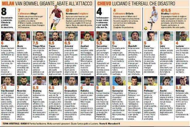 FANTACALCIO MILAN CHIEVO GAZZETTA – Vittoria del Milan sul Chievo per 4-0. Le reti dei rossoneri sono state siglate tutte nel primo tempo. Apre le marcature al 9′ minuto Thiago Silva. Il raddoppio del Milan con Ibrahimovic al 16′, terza rete rossonera con Pato al 33′ e 4-0 finale ancora con Ibrahimovic su rigore al 44′. Con questa vittoria il Milan scavalca la Lazio ed assieme all’Udinese raggiunge il secondo posto in classifica con 24 punti ad un punto dalla capolista Juventus che deve recuperare la partita con il Napoli. Ecco i voti e le pagelle della Gazzetta dello Sport: