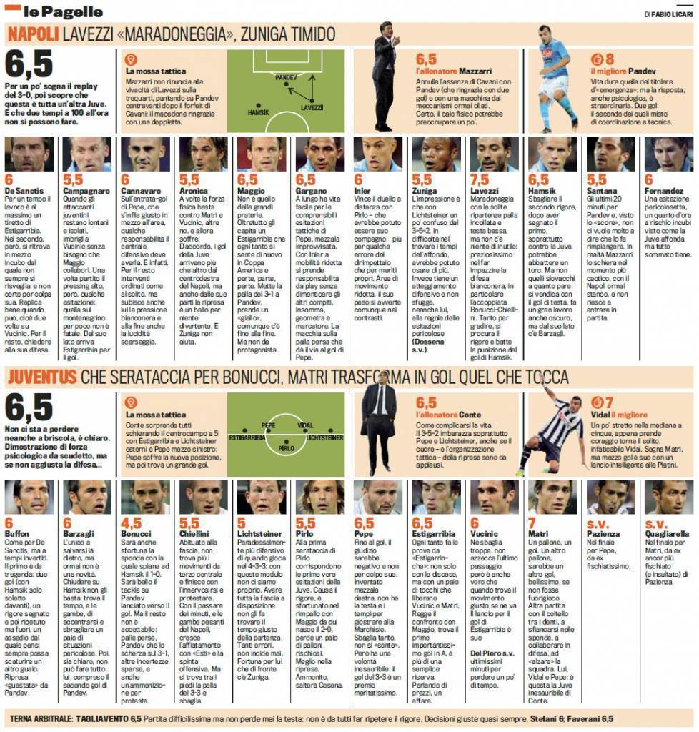 NAPOLI JUVENTUS VOTI PAGELLE GAZZETTA FOTO – Finisce tre a tre il big match del San Paolo tra Napoli e Juventus. Non basta ai partenopei un grande Pandev autore di due gol che hanno fatto dimenticare l’assenza di Cavani. La Juventus è una squadra che non molla mai e ha ripreso per ben due volte i partenopei che erano sopra di due gol. Nella Juventus benissimo Vidal, male invece Bonucci autore di alcuni interventi disastrosi. Ecco i voti e le pagelle della Gazzetta dello Sport.