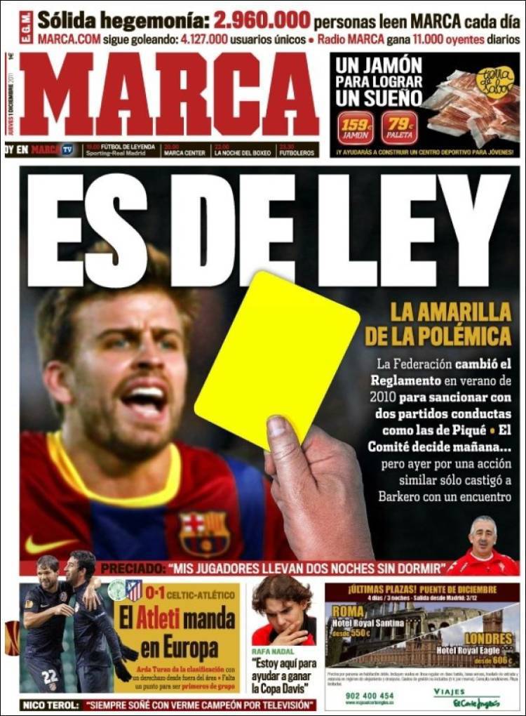 MARCA PIQUE’ – In Spagna è polemica per il cartellino giallo di Piquè voluto fortemente dal giocatore per non incappare in una squalifica in vista del match contro il Real Madrid in programma il 10 dicembre.