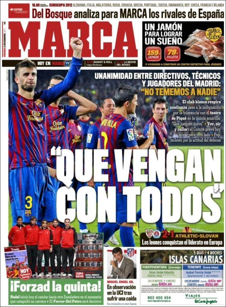 MARCA PIQUE’ – In Spagna divampano le polemiche per quanto riguarda l’ammonizione forzata di Piquè. Ma il Real Madrid non ha paura e chiede di non squalificare il difensore del Barcellona.