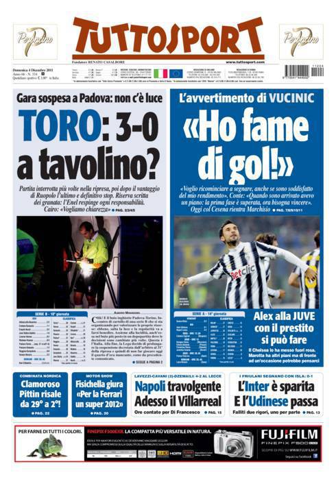 TUTTOSPORT RASSEGNA STAMPA – Tuttosport, come al solito, dedica la prima pagina alle due squadre torinesi. Il Torino di Urbano Cairo che potrebbe vincere 3-0 a tavolino la sfida contro il Padova, sospesa per il ripetuto spegnimento delle luci. Nella colonna di destra, il desiderio di gol di Mirko Vucinic presenta le pagine dedicate alla Juventus. In taglio basso, due riquadri dedicati agli anticipi di Napoli e Inter.