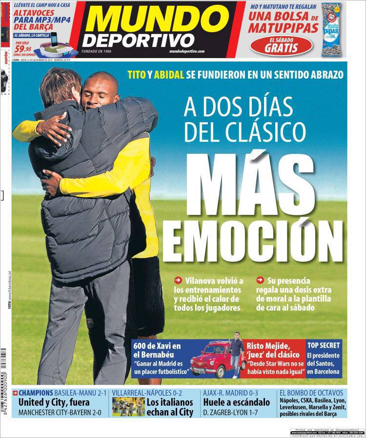 MUNDO DEPORTIVO BARCELLONA – Ieri scena stupenda in casa Barcellona con il secondo di Guardiola, Tito Vilanova che è tornato ad allenare dopo l’operazione e ha subito abbracciato Abidal.