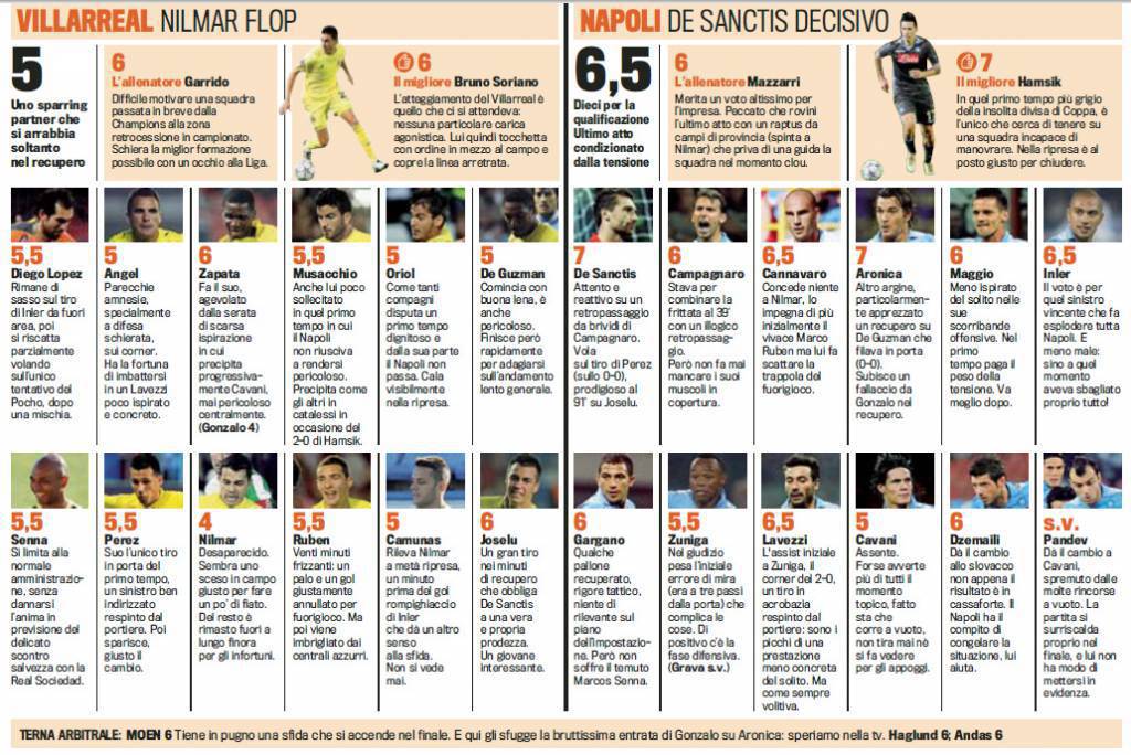 VILLAREAL NAPOLI VOTI PAGELLE GAZZETTA FOTO – Il Napoli vince due a zero al Madrigal contro il Villareal e approda agli ottavi di finale di Champions League. Il club partenopeo riesce così a eguagliare il record dei tempi di Maradona. Festa grande per il Napoli che nel primo tempo è teso e molto contratto. Nella ripresa ci pensa Inler a sbloccare il risultato con un tiro di sinistro dalla lunga distanza. Il Napoli gioca più sciolto e segna il raddoppio con Hamsik. Espulso Mazzarri. Ecco i voti e le pagelle della Gazzetta dello Sport.