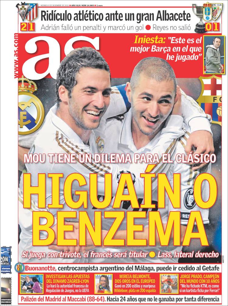 AS HIGUAIN BENZEMA – Sul quotidiano As si parla del grande dubbio di Mourinho che domani non sa se schierare Higuain o Benzema.
