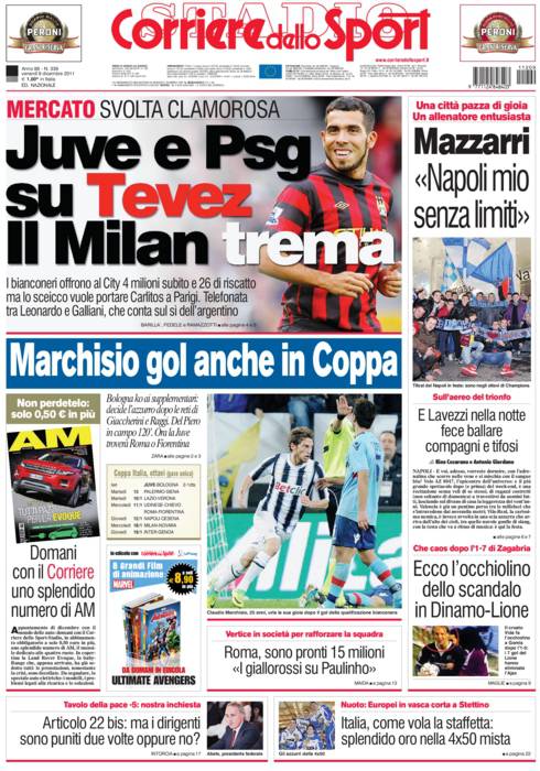 Corriere dello Sport: Juve e Psg su Tevez, il Milan trema 09/12/2011 di Ruggieri CORRIERE JUVENTUS PSG TEVEZ MILAN – Sul Corriere dello Sport si parla di Tevez che piace molto alla Juventus e al Psg. Il Milan trema. Claudio Ruggieri – www.calciomercatonews.com