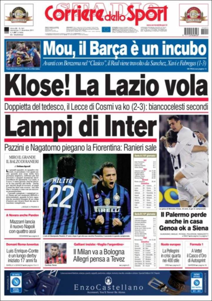 CORRIERE DELLO SPORT KLOSE LAZIO – C’è voluto un super Miroslav Klose per risolvere la pratica Lecce nell’incontro di ieri sera della Lazio. Così la prima pagina del Corriere dello Sport che si concentra sull’attaccante tedesco, protagonista di un inizio straordinario di campionato.